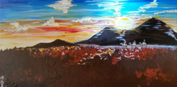 What I find intriguing about this painting is the several places where one’s eyes can focus, from the brilliant sun, to the striking red steaked across the sky, to the deep, rich brown in the foreground. There is of course also the focus on the three figures riding on camels, but they may not be the first thing that one sees. And that is part of the beauty of the painting, and of the story being told through the painting.